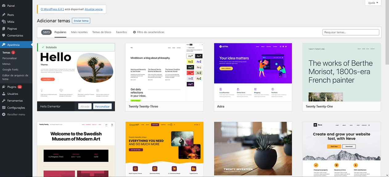 Temas (modelos), ou templates, como alguns chamam, são a estrutura para criar um site. Existem mais de 50.000 temas, alguns gratuitos e a maioria pagos, cada segmento tem uma ampla gama de opções. É como no caso de uma casa, para construir a casa, você precisa de um alicerce para segurá-la, e essa é a função do tema no WordPress – fornecer um alicerce para a aparência do site.